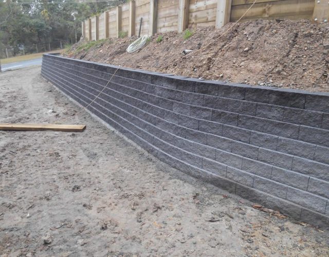 - Construction of durable and visually appealing concrete retaining walls using Flush Face Garden Wall interlocking blocks.