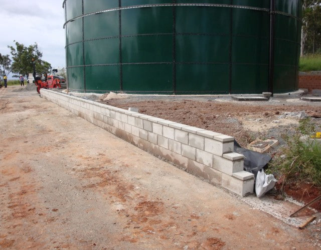 To meet this challenge head-on, we engaged in thorough discussions with the project manager, ultimately selecting Terrace block masonry for the wall at the reservoir's rear. This choice was instrumental in achieving a seamless integration with the site's existing walls. Additionally, we embraced sustainability by incorporating a significant quantity of salvaged blocks from a previously dismantled wall, further aligning with the project's environmental considerations. For the reservoir's front, we opted for a robust 200 series Besser block wall, meticulously constructed after modifying the adjacent road to accommodate this new feature. The wall's design prioritised durability, featuring core filling with concrete and ample steel reinforcement.