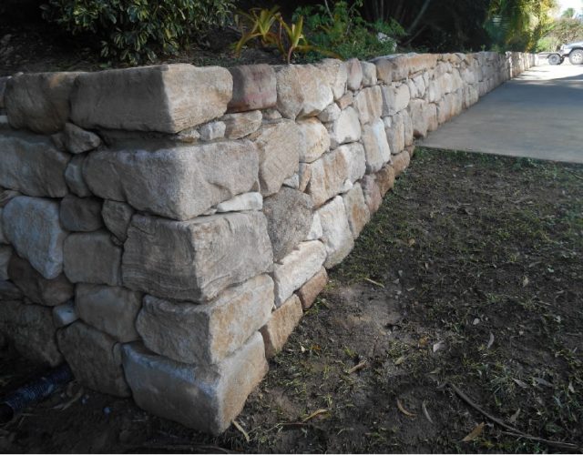 Australian Retaining Walls proposed a Hand Placed & Dry Stacked Sandstone Rock Wall to replace the old timber wall. This choice provided a natural look that the clients desired. The large concrete slab extending from the house to the old wall was left undisturbed, with the new sandstone rocks mortared directly on top of the slab for stability.