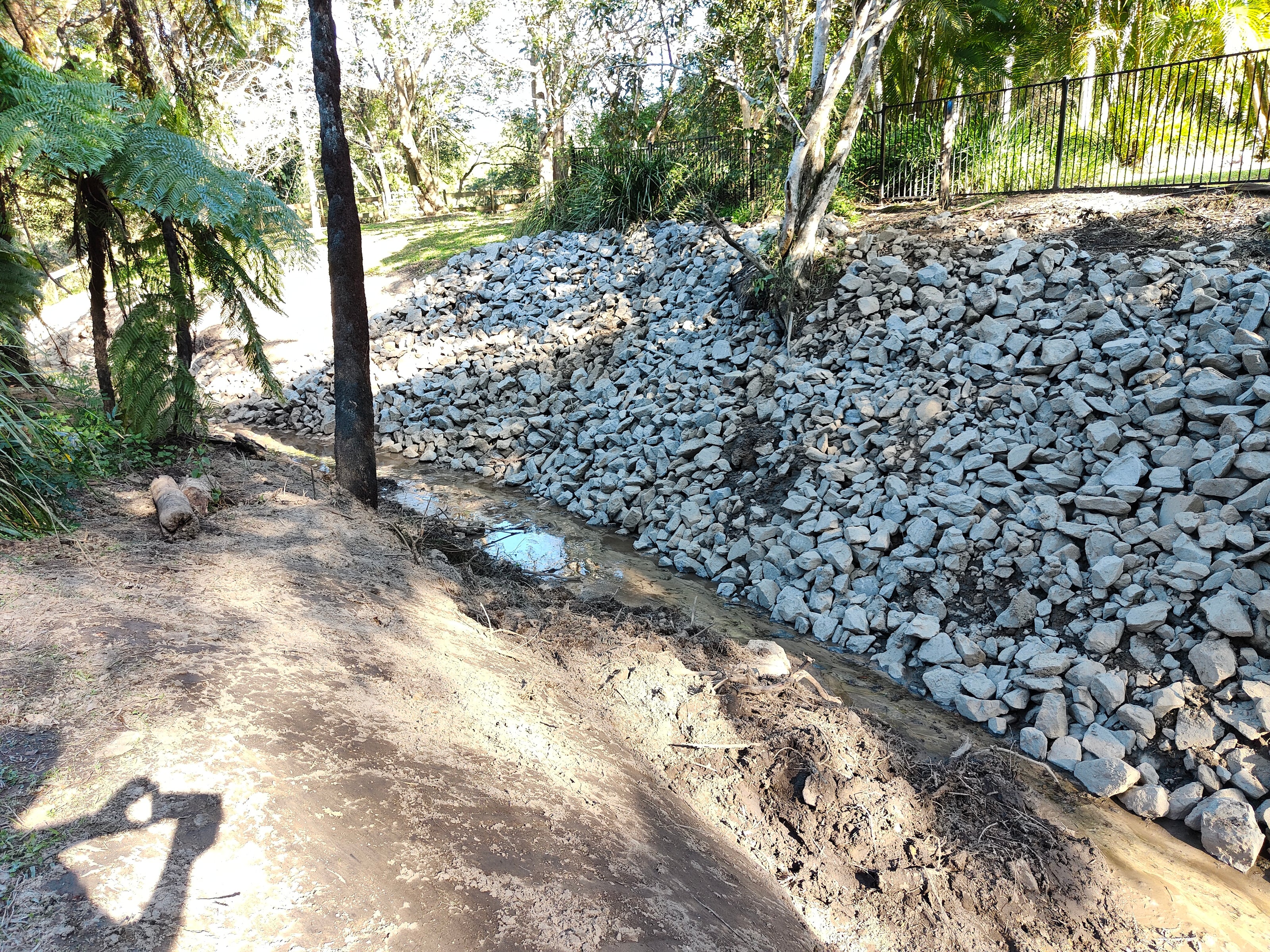The property owner in Bonogin faced significant erosion issues along the creek near their house, which was gradually undermining the embankments. Previous attempts at remedial work had failed, and the client needed a robust solution to stabilise the area. With ongoing erosion threatening the safety and aesthetics of the property, a reliable method was essential to secure the creek banks and prevent further soil loss. Learn more about our rock retaining wall solutions.